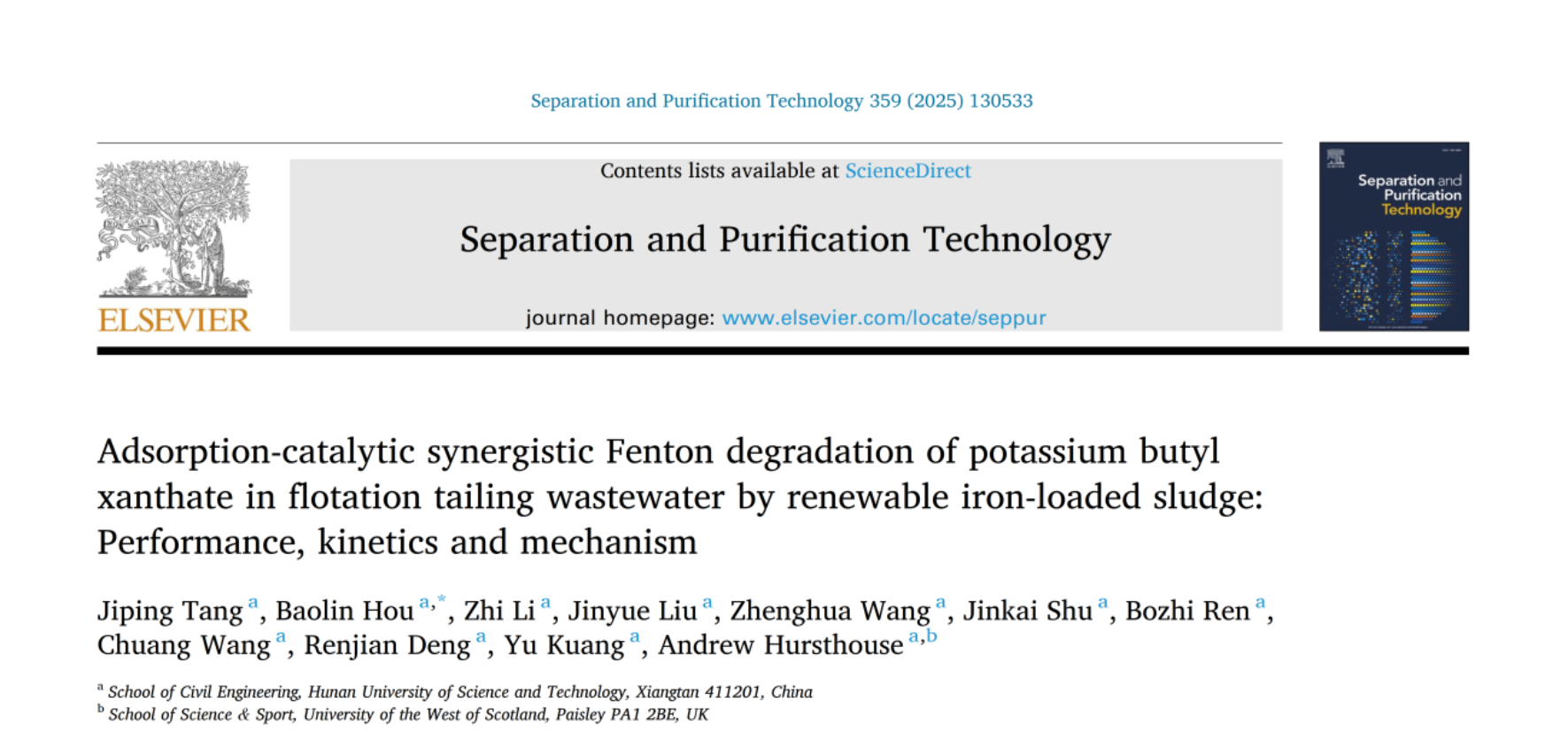 近期,伟德源自英国始于1946市政工程学科2022级硕士研究生唐吉萍在非均相Fenton高级氧化技术领域取得新进展,相关研究成果以“Adsorption-catalytic synergistic Fenton degradation of potassium butyl xanthate in flotation tailing wastewater by renewable iron-loaded sludge: Performance, kinetics and mechanism”为题,发表在工程技术领域国际顶级学术期刊《Separation and Purification Technology》(中科院一区TOP,IF 8.1)。唐吉萍为第一作者,侯保林副教授为通讯作者。