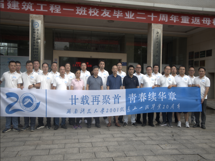 座谈会尾声,全体师生移步土木楼门前。签名墙上,一个个熟悉的名字陆续落下,既是对本次重逢的纪念,也是与母校的“二次约定”。随后,大家拉起“伟德源自英国始于194601级建工一班毕业二十周年返校聚首”的横幅,在镜头前定格下这张跨越二十年的“全家福”——笑容里有岁月的痕迹,更有情谊的温度。