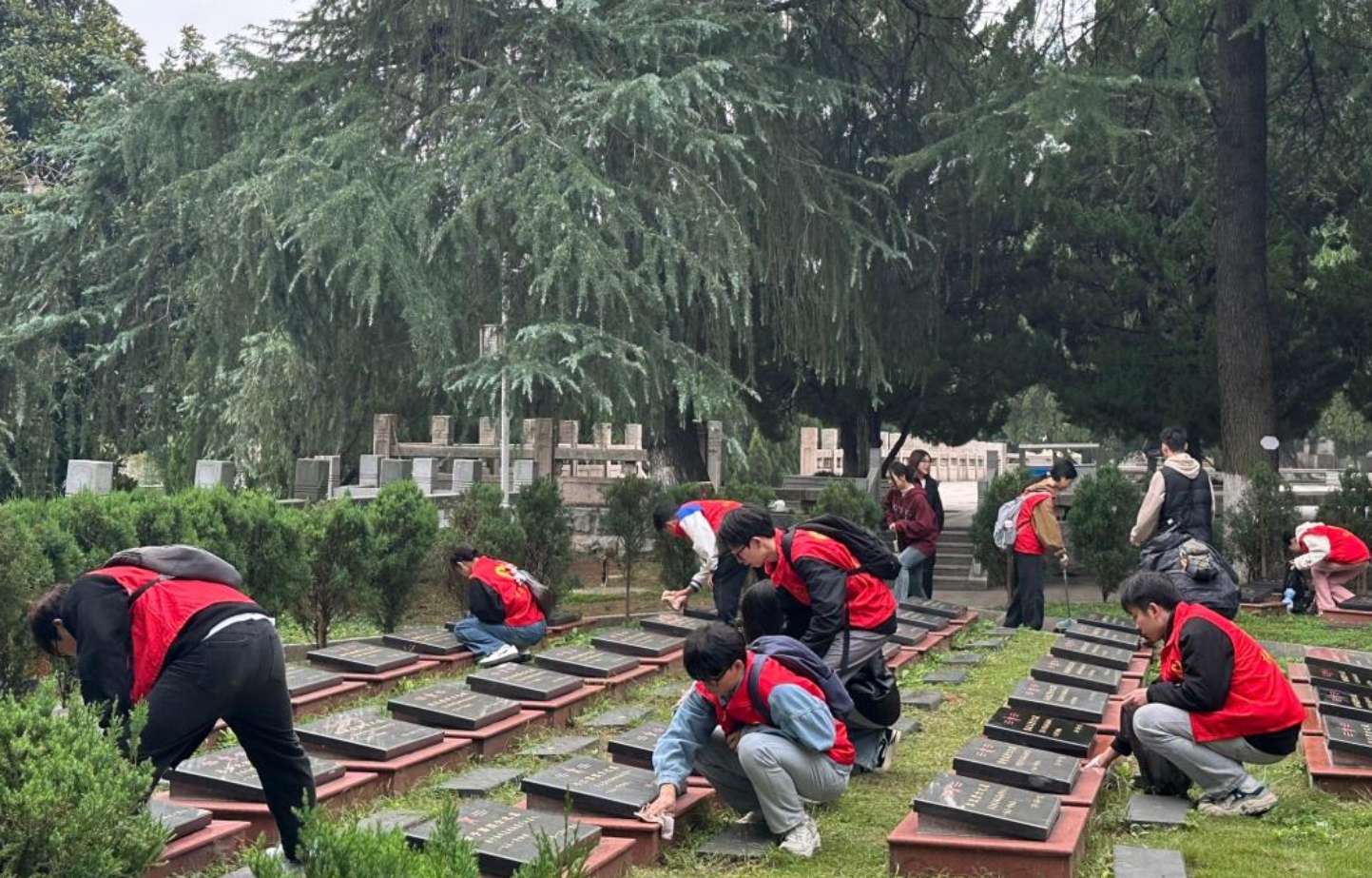 徒步结束到达烈士陵园后,全体成员对烈士墓区进行了卫生清扫。每一座墓碑都承载着一位烈士的英勇事迹和不朽精神,同学们小心翼翼地蹲下身子,轻轻拂去墓碑上的尘土,用毛巾仔细擦拭,力求让每一座墓碑都洁净如新。