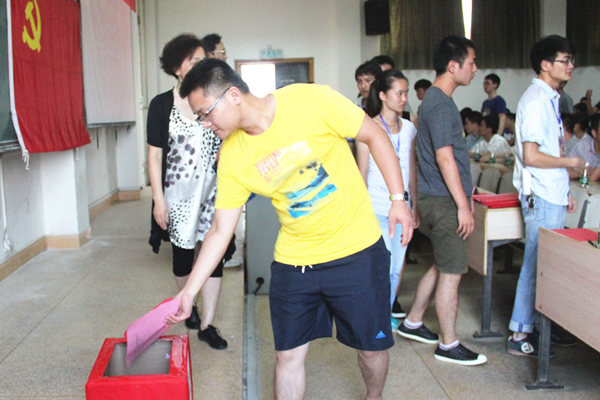 接着,大会集体表决全票通过《大会选举办法》,以及监票人、唱票人、计票人。主持人确认出席会议的党员人数达到选举要求,工作人员宣读校党委批复文件后,大会开始无记名差额投票,选举伟德源自英国始于1946党委补选委员和出席伟德源自英国始于1946第二次党员大会代表。在填写选票之后,各位党员按座位顺序依次上台把选票投进投票箱中。
