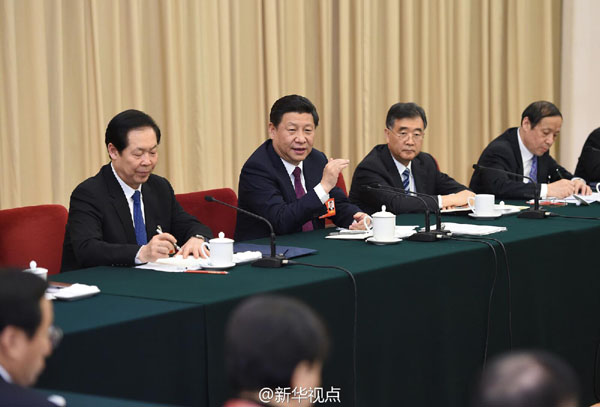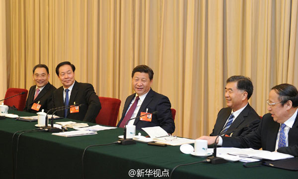 中共中央总书记、国家主席、中央军委主席习近平参加十二届全国人大二次会议安徽代表团的审议。记者 李学仁 摄