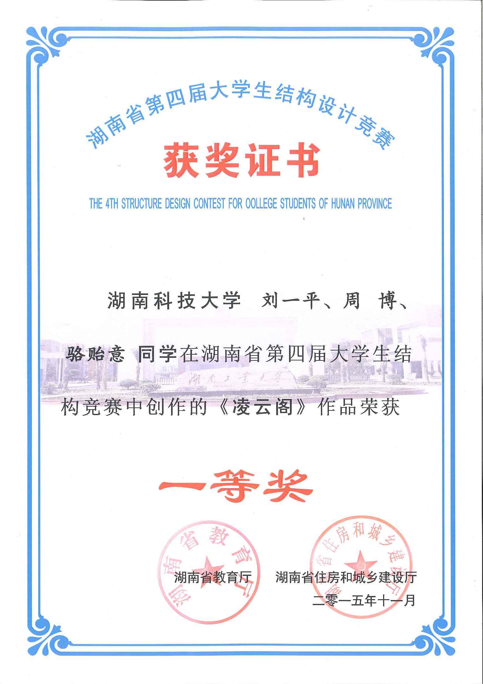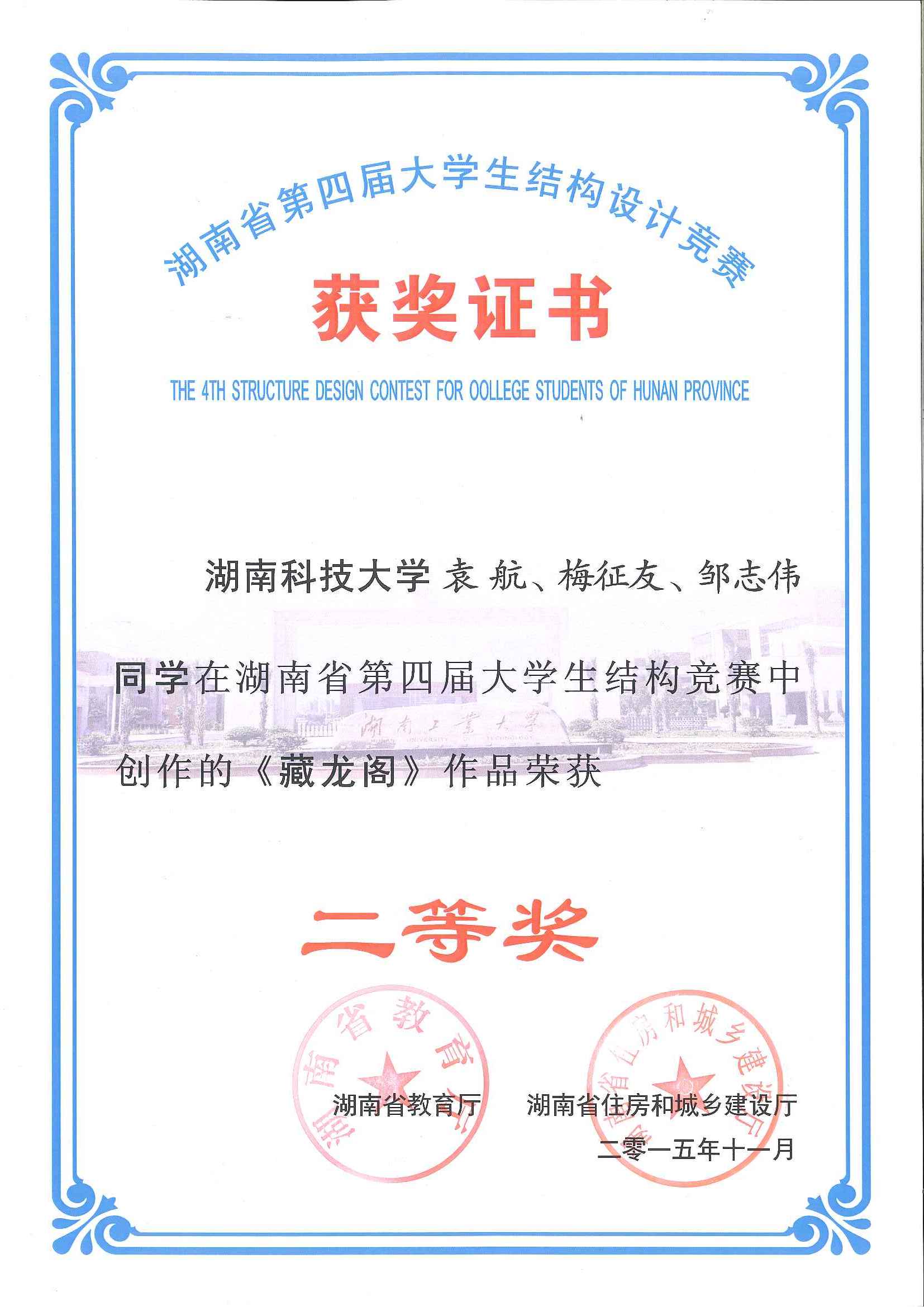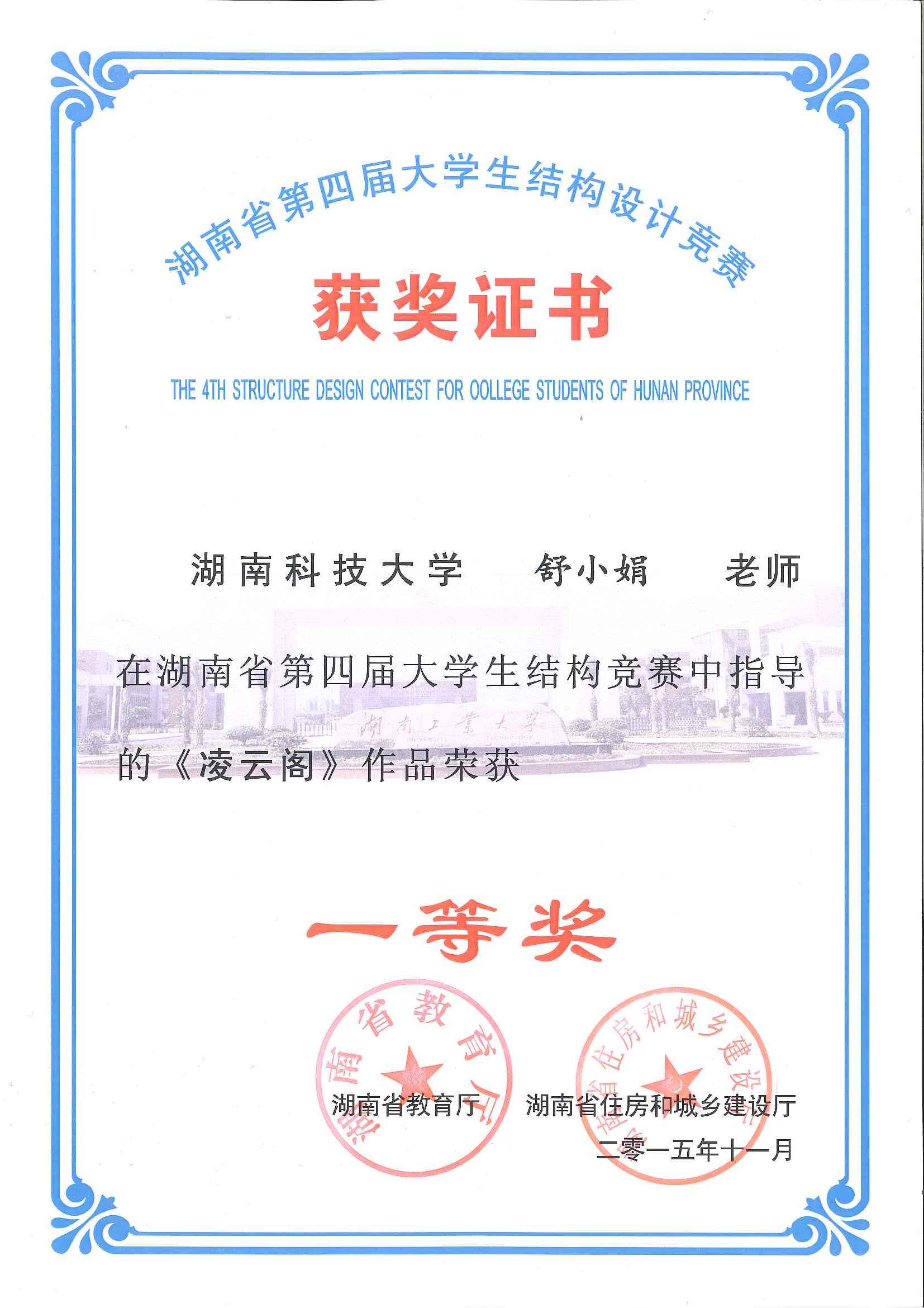 2015年11月27日至29日,湖南省第四届大学生结构设计竞赛在湖南工业大学成功举办。伟德官网组织和选派了4支队伍参加了本次比赛,其中舒小娟老师指导的参赛队伍现场完成的名为“凌云阁”的模型获得了一等奖,由汪建群老师、禹见达老师、李永贵老师分别指导的三组学生也均荣获二等奖。本届竞赛再次展现了伟德官网在湖南省大学生结构设计竞赛中处于领先的水平。
