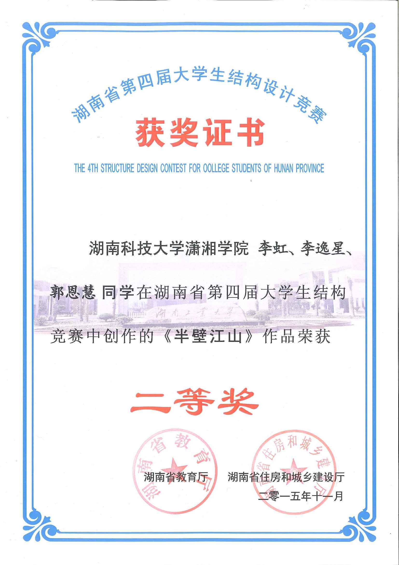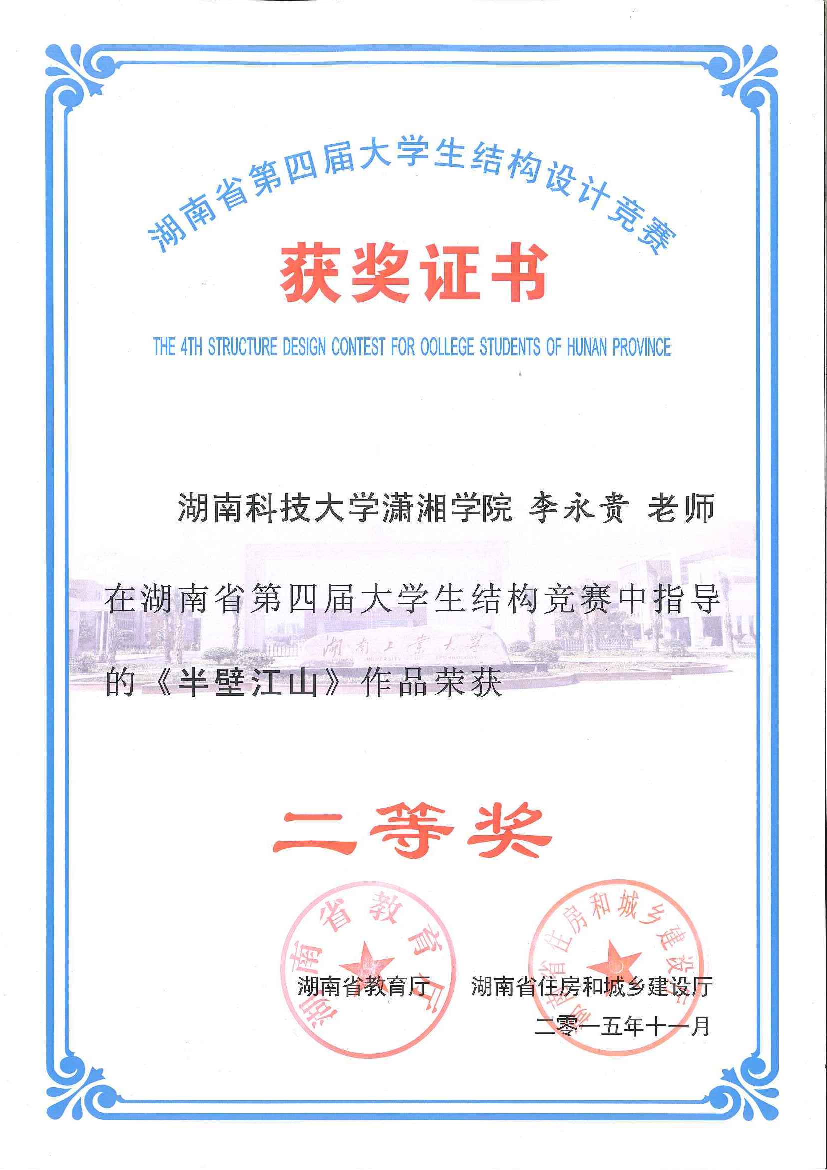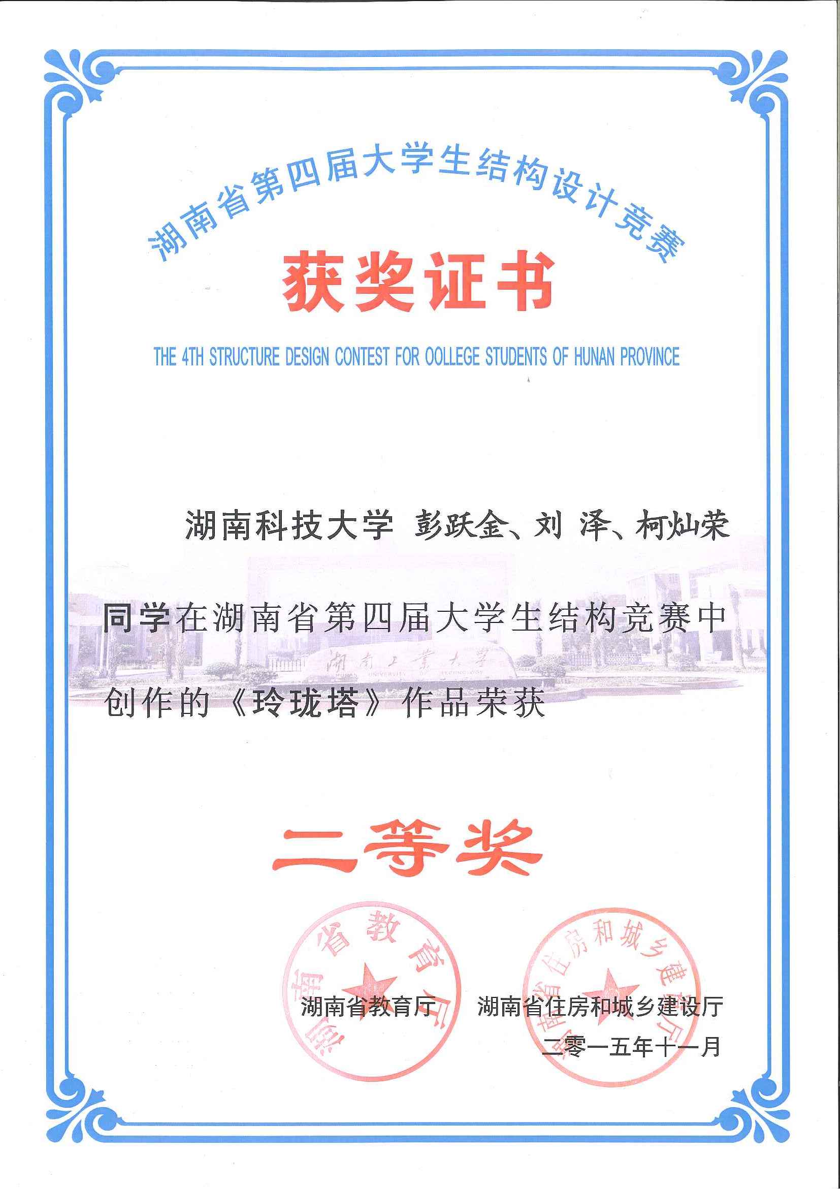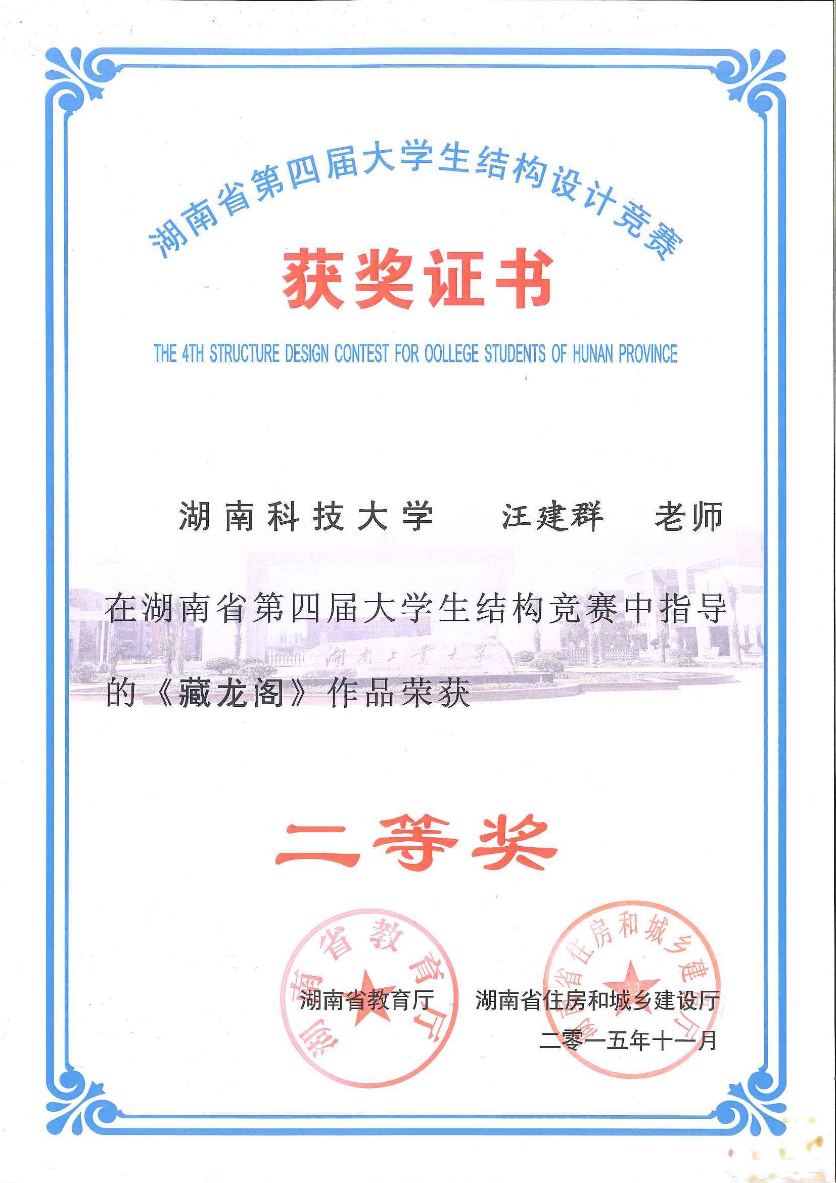 2015年11月27日至29日,湖南省第四届大学生结构设计竞赛在湖南工业大学成功举办。伟德官网组织和选派了4支队伍参加了本次比赛,其中舒小娟老师指导的参赛队伍现场完成的名为“凌云阁”的模型获得了一等奖,由汪建群老师、禹见达老师、李永贵老师分别指导的三组学生也均荣获二等奖。本届竞赛再次展现了伟德官网在湖南省大学生结构设计竞赛中处于领先的水平。