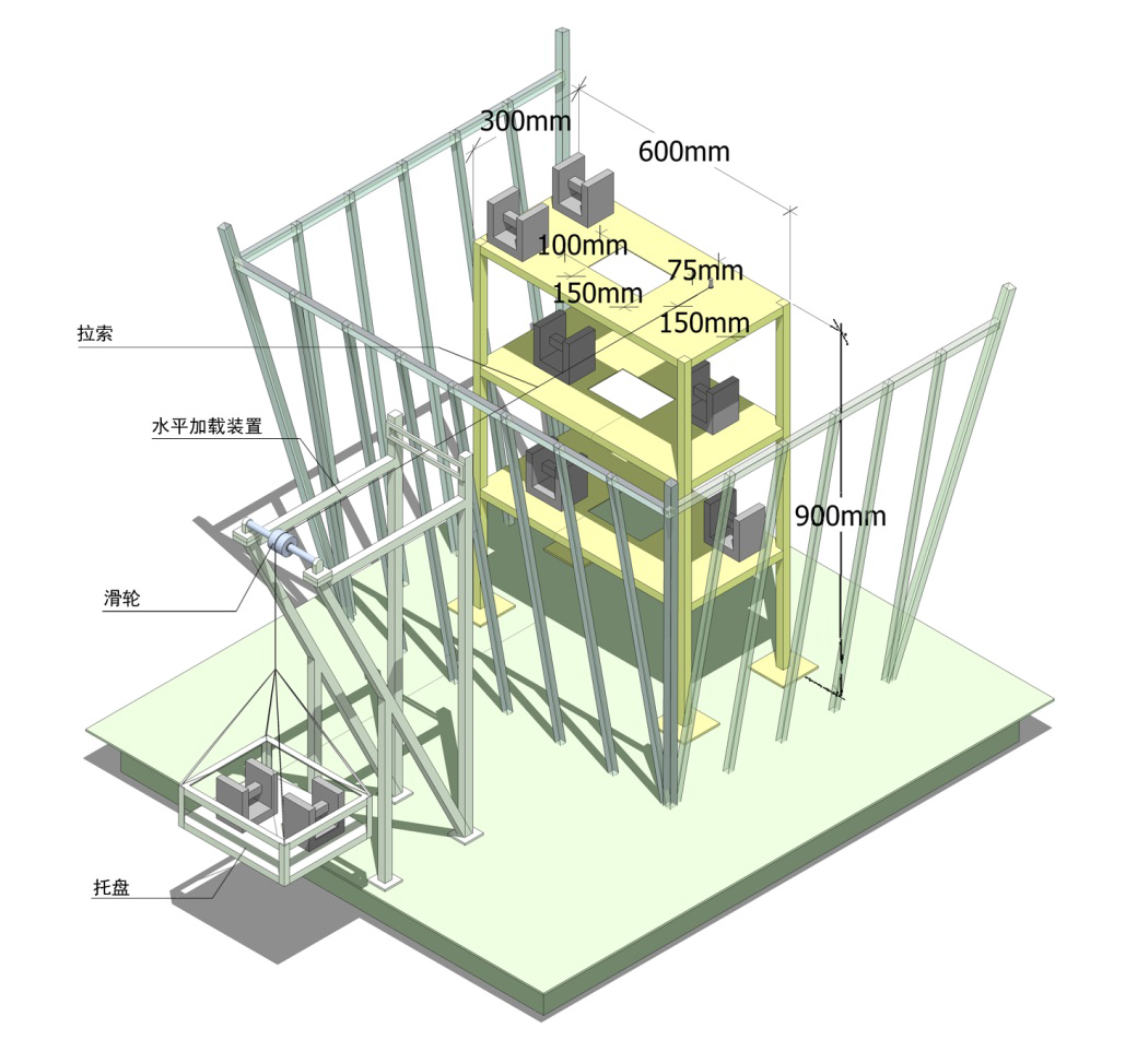 加载分为水平加载和竖向加载,竖向加载为二、三楼面和屋面每层2个10kg的砝码,从下层往上层施加。水平加载采用吊挂加载,加载点设定在屋面,通过钢丝绳和滑轮连接,下挂钢结构托盘,水平加载级别最多4级,砝码总重不得超过150kg,每级加载后,须持荷20秒以上。