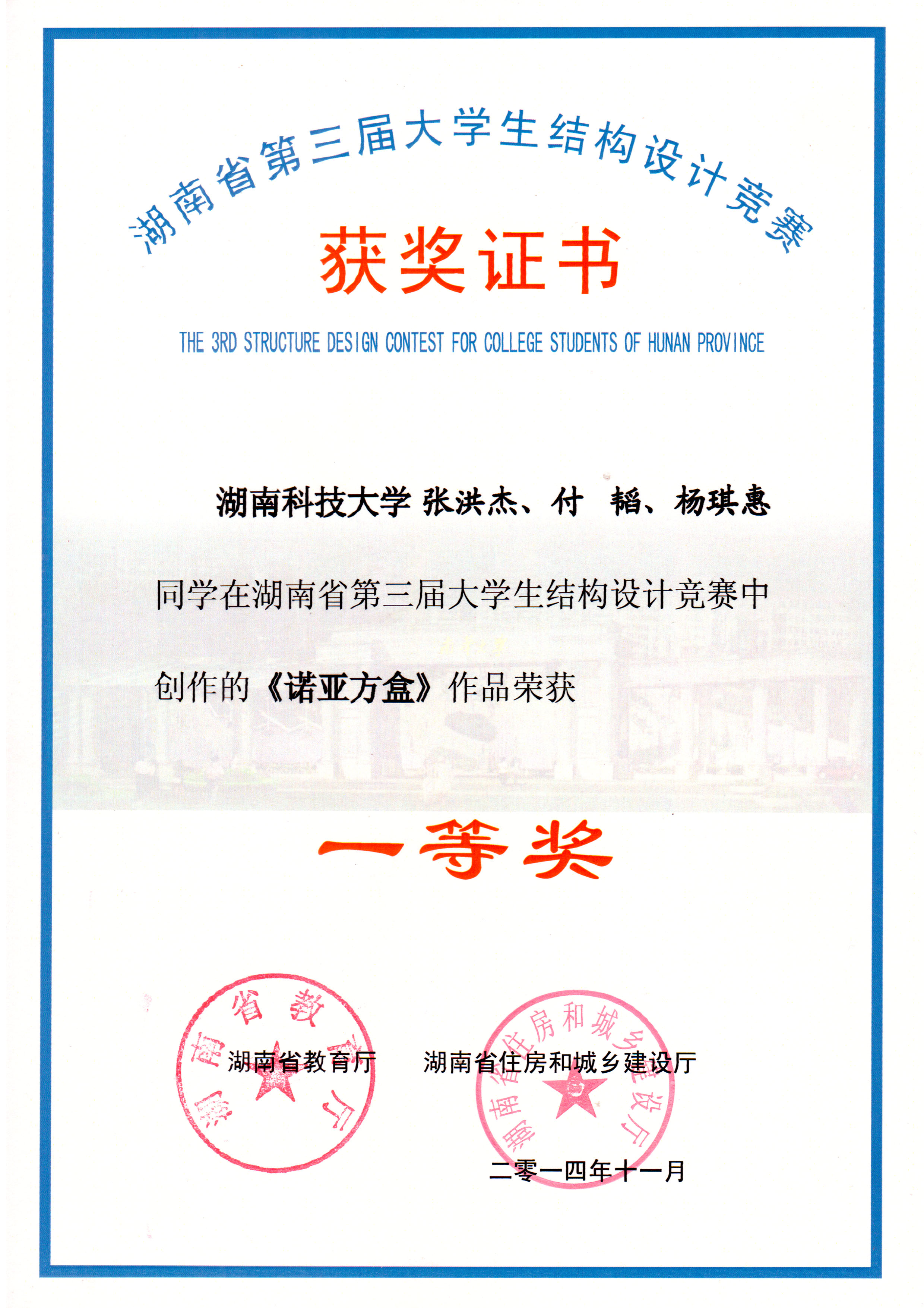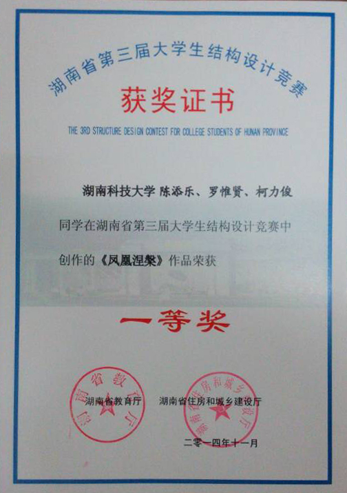 湖南省第三届大学生结构设计竞赛于2014年11月28日至30日在南华大学举行,本次竞赛共有28所普通高等学校的64支代表队参加。伟德官网组织和选派了4支队伍参加了本次比赛,其中汪建群老师和舒小娟老师指导的学生团队分别以第一名和第二名的成绩斩获2项一等奖,同时取得一个参加全国总决赛的资格。本届竞赛标志着伟德官网在大学生结构设计竞赛的指导上已步入一流水平。