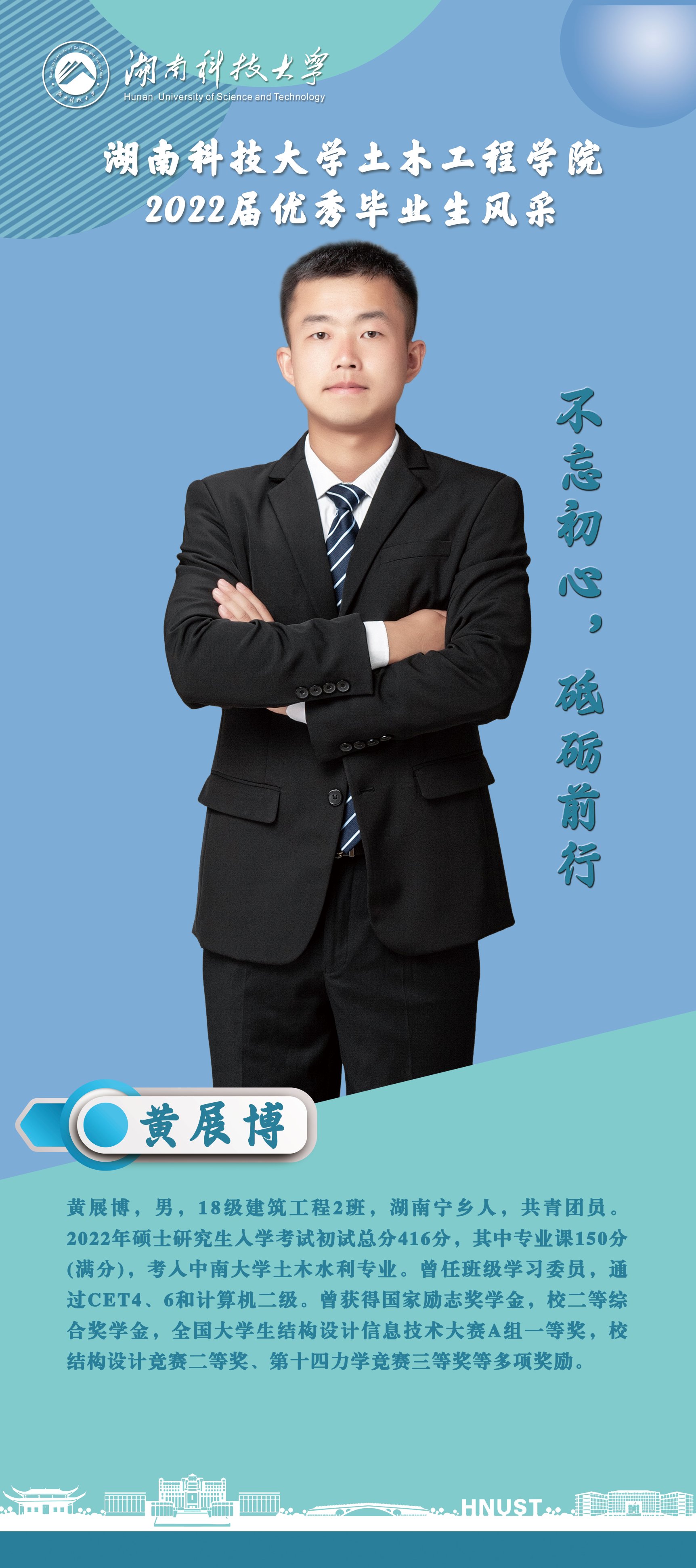 黄展博,男,18级建筑工程2班,湖南宁乡人,共青团员。曾任班级学习委员,在校期间获得“国家励志奖学金”,“二等综合奖学金”,“全国大学生结构设计信息技术大赛A组一等奖”,“伟德源自英国始于1946第八届结构设计竞赛二等奖”,“结构建模协会第三届设计竞赛三等奖”,“伟德源自英国始于1946第十四力学竞赛三等奖”等多项奖励,并顺利通过CET4、CET6、全国计算机二级考试。2022年硕士研究生入学考试初试总分416分,其中专业课150分(满分),考入中南大学土木水利专业。