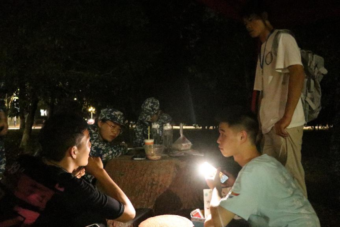 训练一段时间后,各排进行短暂的休息。训练刻苦,感到身体不适的,也得到了值班干部们妥善的关心和照料。休息期间当然少不了才艺展示,他们席地而坐,轮流派人展示才艺“叫你上!你就上!扭扭捏捏像啥样?”“叫我上,我就上?我的面子往哪放?”训练场上洋溢着欢声笑语,充满轻松活跃的氛围。