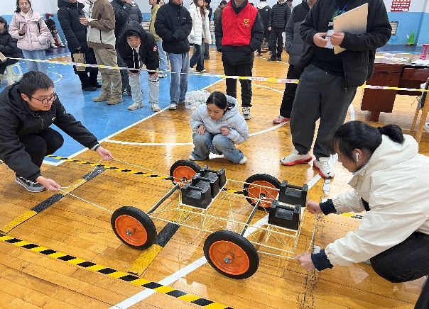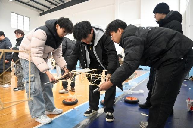 比赛现场气氛紧张热烈。入围校赛的各支队伍依次进行作品展示与加载测试。荷载逐级施加的过程中,模型的受力表现成为全场焦点。部分作品凭借科学的结构体系与精细的制作工艺,成功承受高强度荷载,赢得现场阵阵掌声;个别模型在测试中出现失效情况,参赛选手沉着应对,清晰阐述设计思路与优化方向,充分展现出良好的工程素养与竞赛态度。