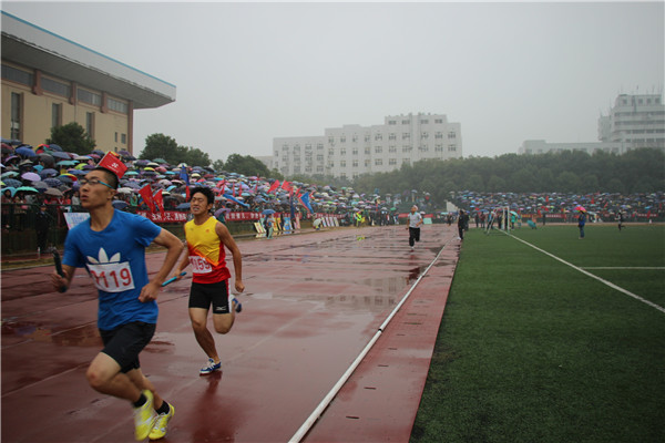 虽说赛时天空下着雨,但雨水的冰冷丝毫没有减弱土木人的激情。当伟德官网运动员上场的那一刻,整个土木学院的看台沸腾了。在锣鼓的节奏声下,所有的土木观众都站起来为他们呐喊助威。裁判员一声枪响,伟德官网第一棒农宇一马当先,和其他队员一样如离弦的箭一般飞奔而出。在整场比赛中,每支代表队都竭尽全力,你追我赶,竞争相当激烈。尤其在最后一棒时,伟德官网王健在距终点一百多米的弯道处突然加速,迅速超越前面的选手,赢得了观众的阵阵赞许,最终伟德官网代表队赢得了决赛第五的好成绩,为土木争了光,验证了那句“钢筋水泥混凝土,我的赛场我做主”。比赛结束后,运动员来到土木观众台,向观众打招呼,观众同时也欢呼雀跃,喜迎王者归来!