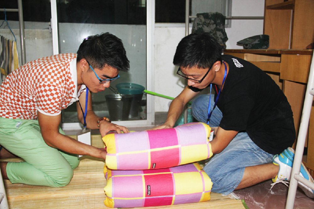 9月10日晚,新生军训的第二天,晚上的任务是整理内务,教官下寝教同学们叠被子。教官演示几遍后便让同学们自己练习,但是很多同学掌握的不是很好,所以伟德官网的志愿者便手把手教新生叠被子。