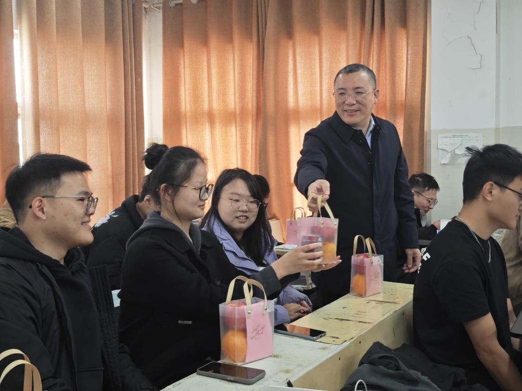 ▲院领导为学子们分发考研“加油包”