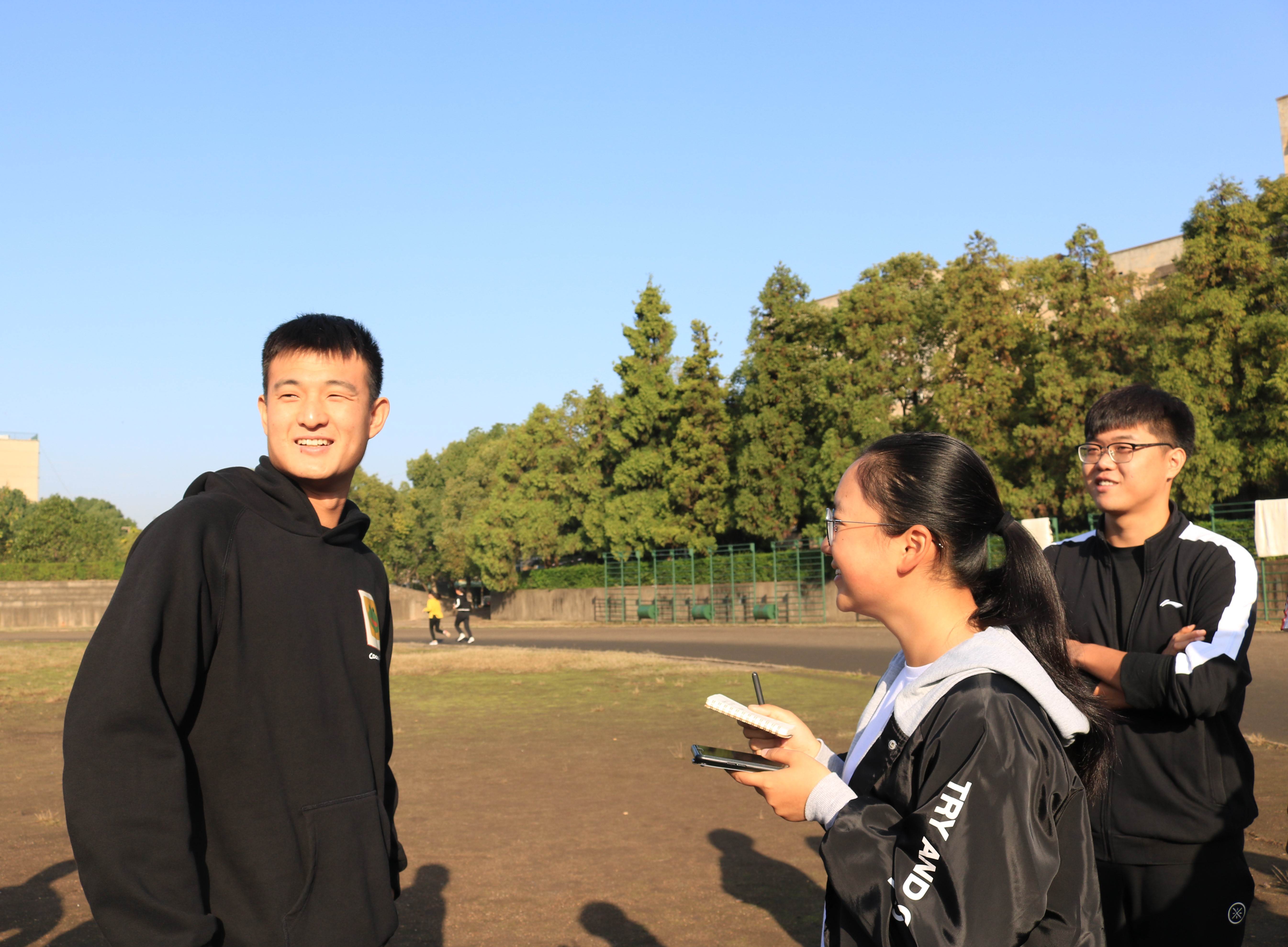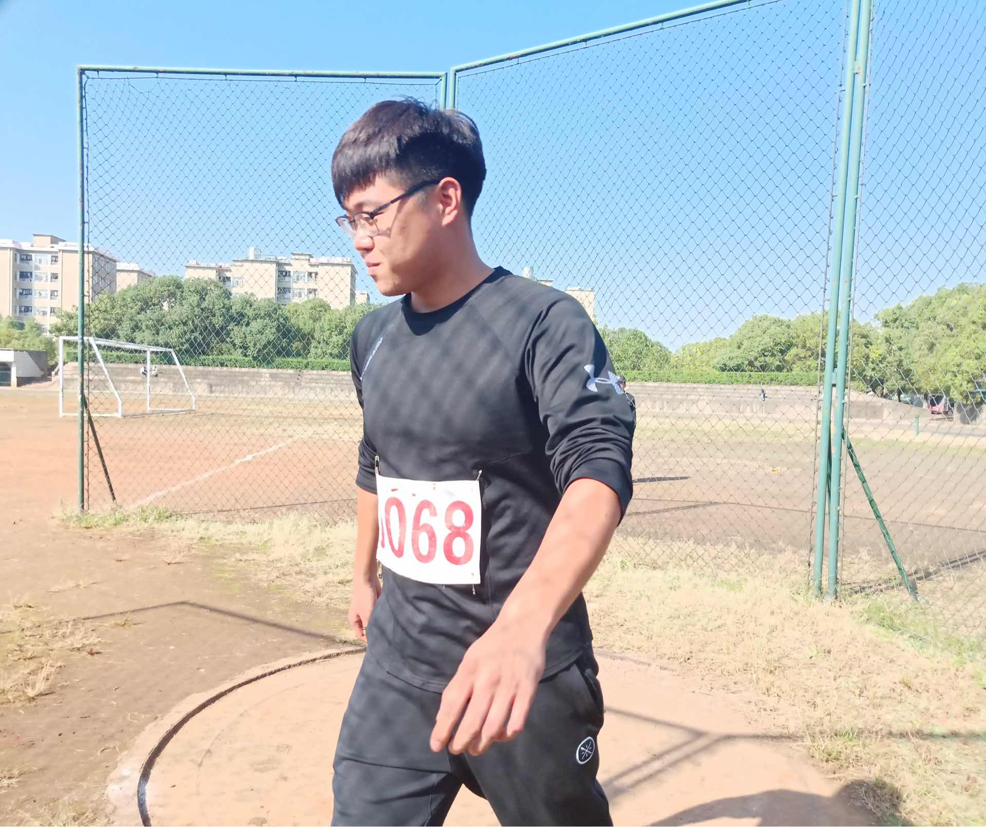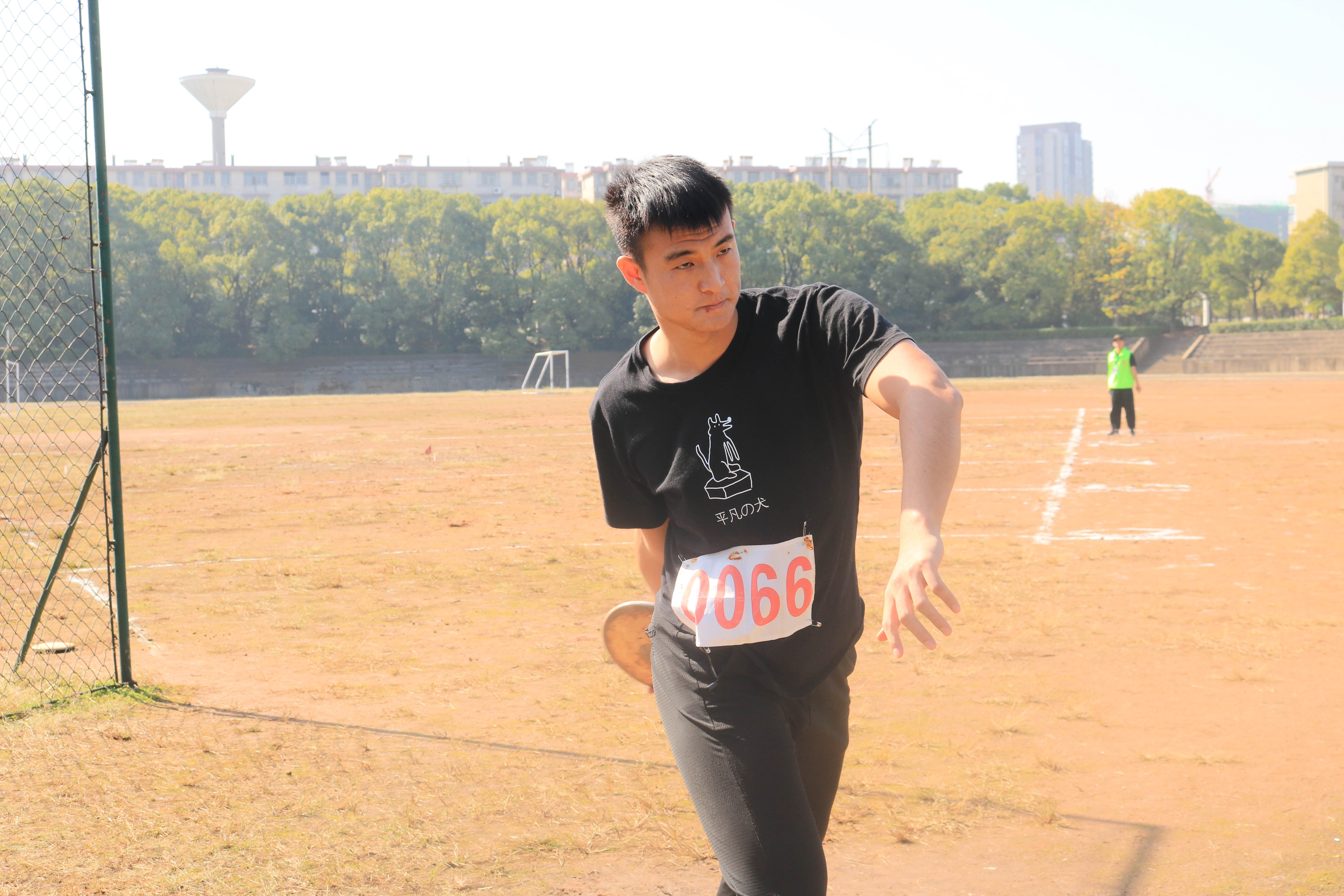 田径场上,初阳和煦,温暖的阳光洒在身上。所有参赛选手们早早地在比赛场地等待比赛开始。杜景勃和马佳南趁比赛前的几分钟做拉伸动作,活动筋脉,避免受伤。紧接着裁判员对运动员进行点到,运动员们满怀信心,答“到”声音响亮有力。待裁判员的一声令下,参赛选手们立刻调整到最佳状态,准备投掷。参赛选手依次从容不迫地上场,先是擦拭铁饼,然后准备投掷,右手握住铁饼,不断调整姿势。裁判员的指挥旗一挥,马佳南便开始进行预摆动作,使铁饼获得初速度,为旋转创造有利条件。紧接着,弯曲的右腿蹬地,上体向左转动,同时左膝外展,使身体处于最大限度的扭转拉紧状态,铁饼远远留在右后方,左臂自然微屈于胸前,最后快速用力向前挺胸挥饼。铁饼便以一道优美的抛物线抛出,只听见铁饼“嘭”的一声砸在地上。有着丰富参赛经验的参赛选手杜景勃和马佳南在接受采访的时候都表示希望能为学院获得更多荣誉,同时还提到在大学四年的比赛经历中深深体会到了体育精神和拼搏精神。