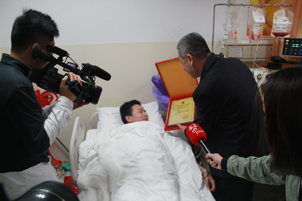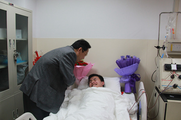 2016年5月9日,在长沙中南大学湘雅医院,康明即将完成造血干细胞的采集。伟德官网党委副书记易贵元、辅导员赵晓玲、团委学生会干部代表前去医院慰问。