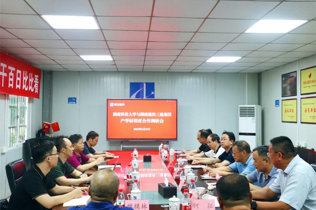 会上,祝明桥书记介绍了湖南省智慧建造装配式被动房工程技术研究中心的相关组成、人才队伍、成果转化与技术推广,同时提出借助建筑工业化、智能化、数字化、信息化的契机,校企双方通过紧密合作,将节能、双碳等运用在转型升级中。总工程师孙志勇表示,在开展深度产学研融合时,要注重成果导向和市场导向,从以企业主导的产学研深度融合为抓手,实现产学研理论与效益上的双赢和团队友情上的双赢。双方围绕产教深度融合这一主题,就如何开展深度产学研融合、企校联动机制、技术创新与智慧建造等方面交换了意见,确立了战略性框架,以智能引领建造,做好科技创新,达成育人共识,让校企合作走深走实。