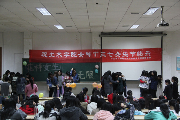 随着主持人风趣的话语,活动在一片热烈的掌声中拉开了帷幕。首先,赵晓玲老师发表了讲话,她表示,希望土木的女生能够努力学习,在大学四年中不断地完善自己,丰富自己的内心世界,使自己变得更加优雅美丽。随后曾淑艳老师说:“愿我们土木女生不仅是一个内心强大的“女汉子”,还要妩媚动人,心灵手巧,愉快而充实地度过一个美好的大学生活。”接下来是学生会副主席杨鑫发言,他说能在女生节收到邀请是他的荣幸,也祝福所有女生能变得越来越优秀。之后便是节目表演环节。第一个节目是合唱《小幸运》,全场安静聆听,结束时掌声顿起。接下来是小品《回家》,幽默的语言逗的观众们捧腹大笑。独唱《a little love》一次次的引发掌声。踩气球,心有灵犀,踩报纸等特色游戏将晚会引向高潮。许多同学踊跃参加,游戏形式新颖有趣,现场气氛十分热烈。最后的压轴活动是男生“送温暖”。又引起女生们的掌声和尖叫。