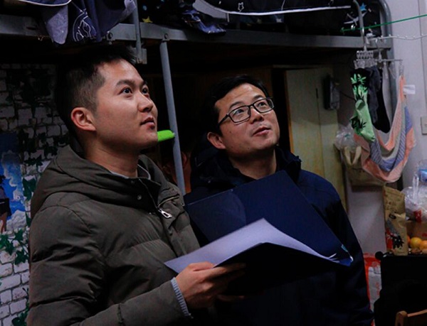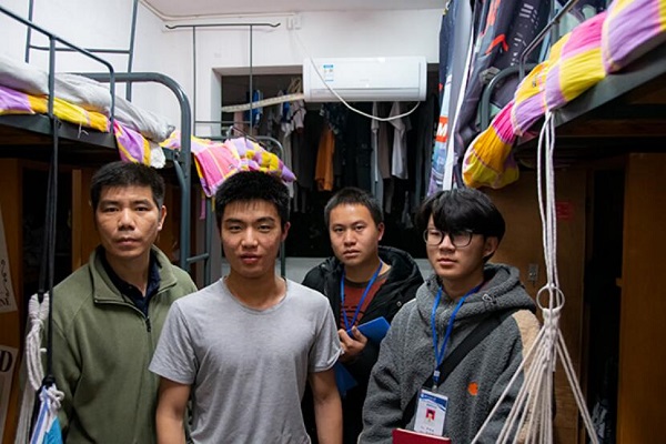 校团委书记马缤辉,18级辅导员廖继彪在视察寝室