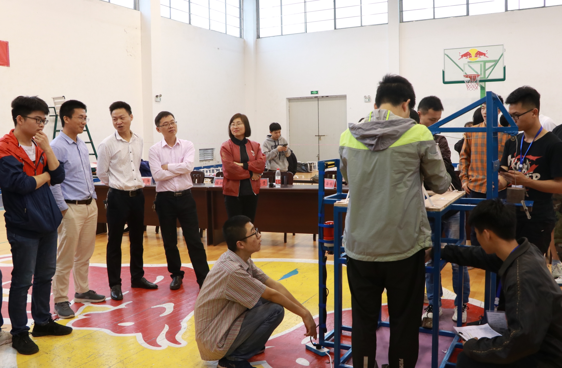 比赛前,嘉宾评委老师们在致辞中指出结构设计竞赛增强了大学生的创新意识,也培养了其动手能力,无论最终结果如何,比赛结果并不是最重要的,重要的是可以学到书本上学不到的经验,并预祝参赛选手赛出理想成绩。紧接着,比赛正式开始,科技协会成员有条不紊地进行检测、称重、加载、登记成绩等过程,不容丝毫懈怠。加载环节时,各组选手都小心翼翼地将模型结构底座固定在加载台上,待稳定后进行砝码加载。选手们都全神贯注于手中的拉索,现场气氛激烈而紧张。对于加载成功的模型,黄海林老师认为主要有四点,分别是模型构造选型巧妙、制作工作精良、团队协作合理和加载现场的运气。郝副院长表示加载失败大多由于不注重细节和专业知识不够。竞赛中加载成功的作品还会经过最后评定,角逐出最终的胜利者。