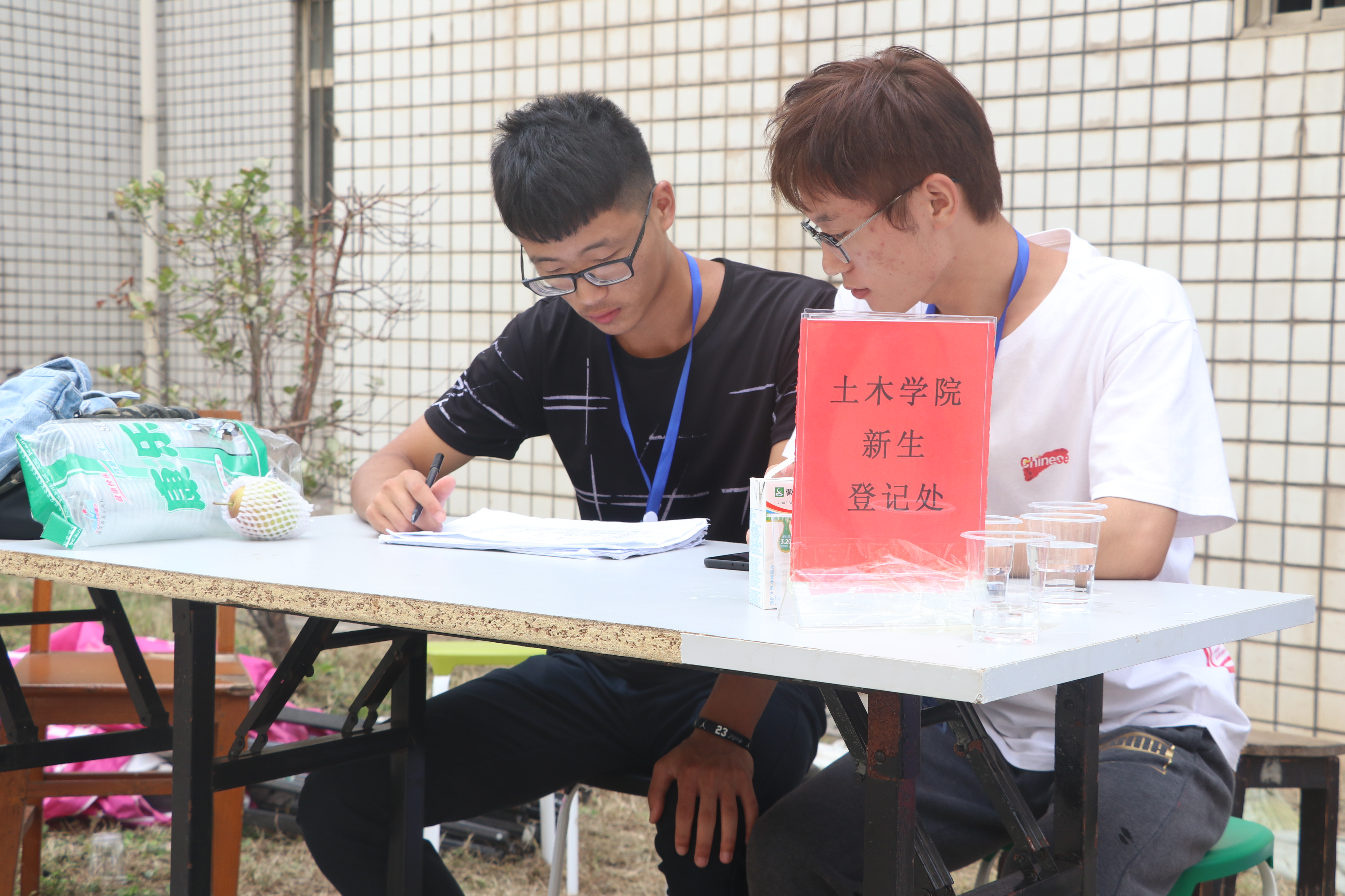 一个小时后,学校四区宿舍随处可见提着行李的学生、家长,以及随处奔波的志愿者。18级辅导员赵晓玲老师、廖继彪老师也在楼下帮新生答疑解惑。志愿者们带领新生来到宿舍,帮助他们收拾宿舍并指导他们完成现场报道的各项步骤。各班的助班与蹲点也穿梭在宿舍楼之间,及时了解本班新生报到情况。同时,楼道里巡逻的各部门副部长们不断走动,阻止一切推销行为,并协助志愿者解决新生遇到的困难。12:00,志愿者们依旧坚守在自己的工作岗位,办理现场报道的桌子便成为了他们的饭桌。仓促地解决午饭后,他们又热情地投入到了下午的迎新工作中。