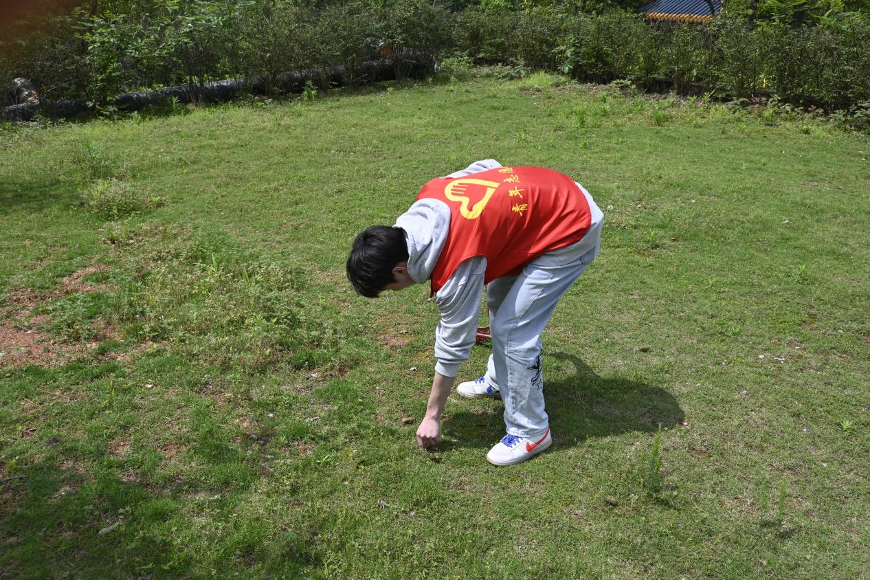 图为志愿者捡拾草地的落叶和碎屑,认真清洁着草地上的每一个角落。