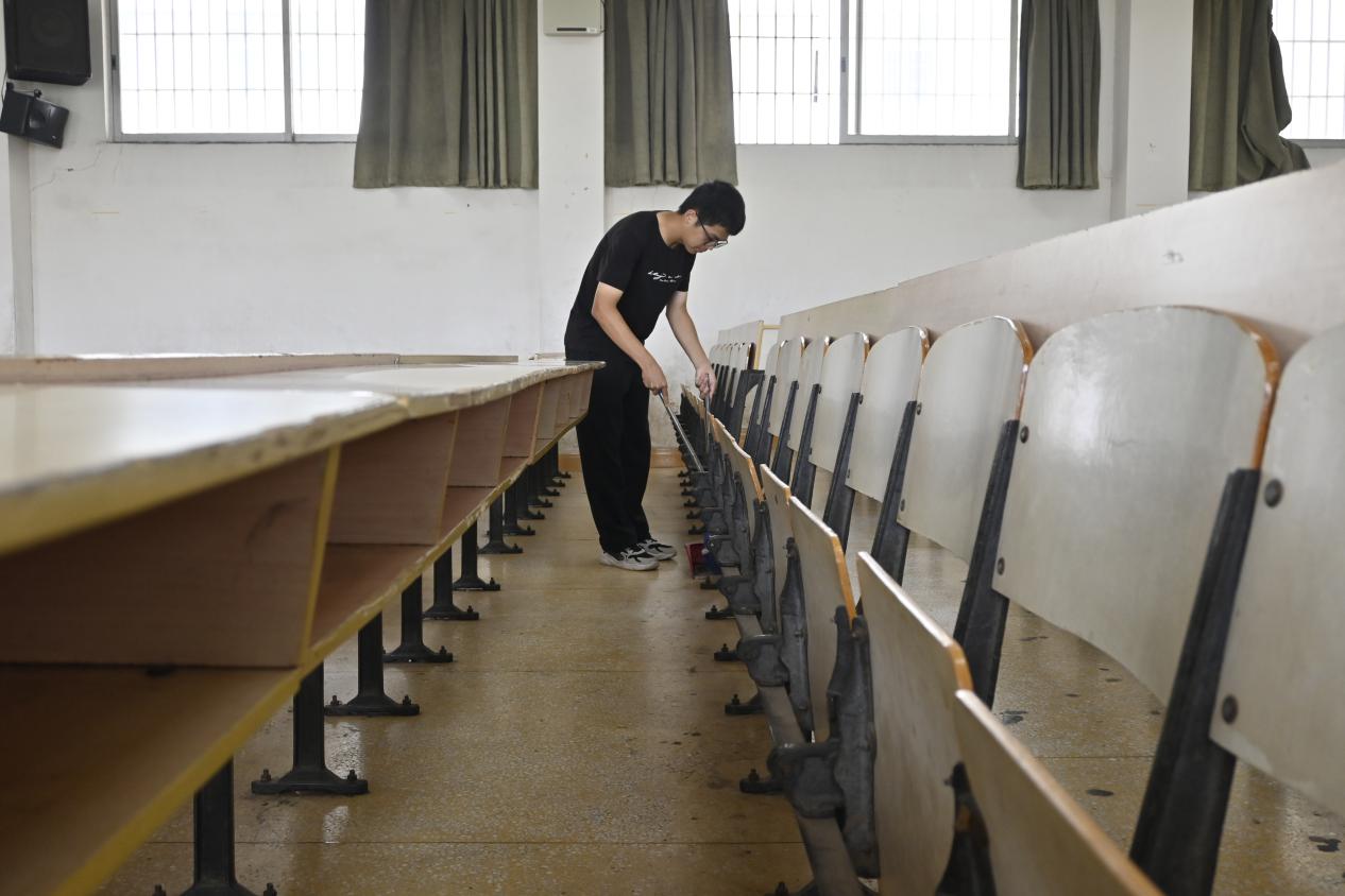 图为志愿者打扫第五教学楼教室卫生,确保教室整洁的环境。