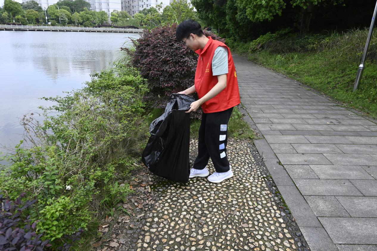 图为志愿者清扫月湖边的纸屑,确保月湖清澈美丽。