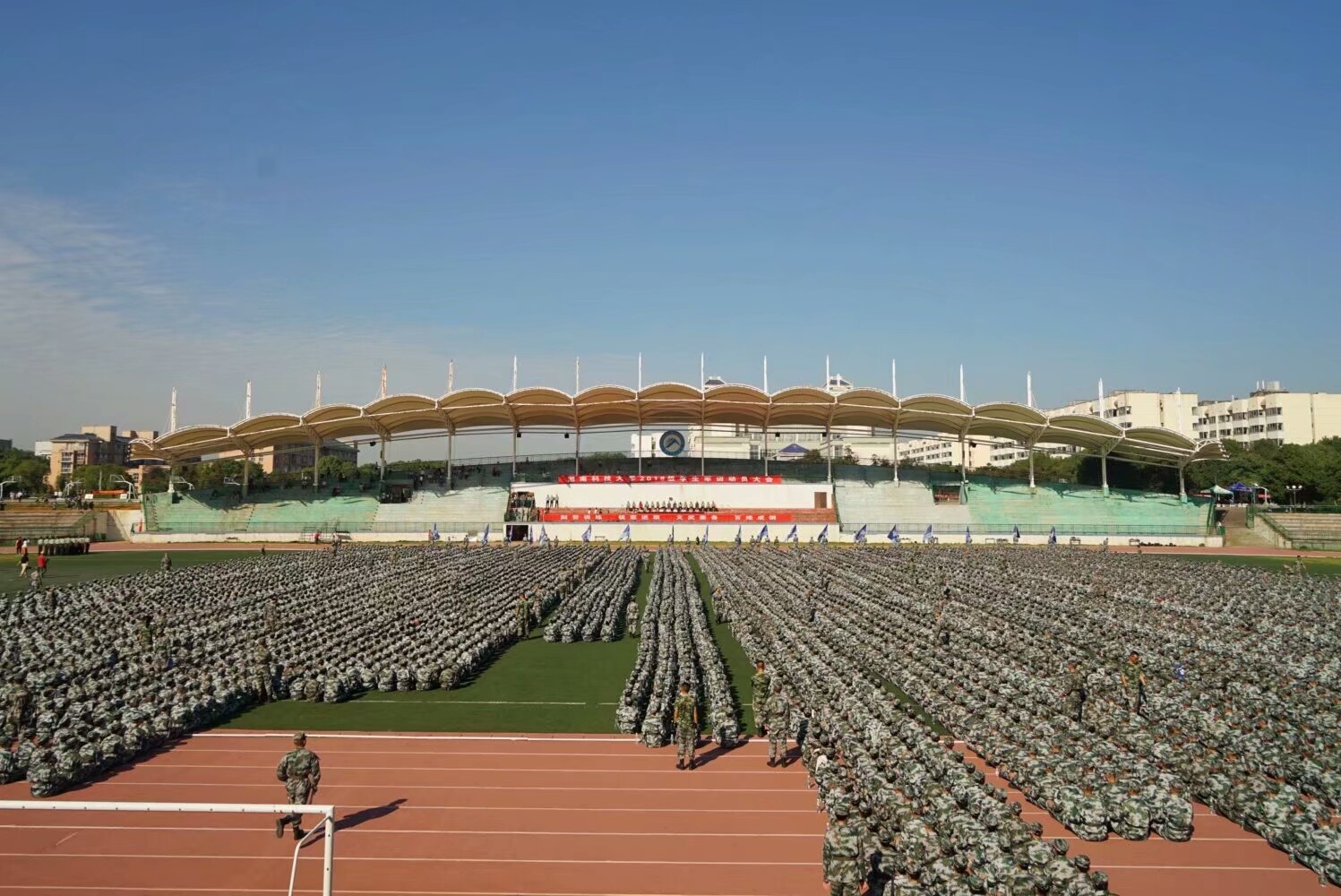 9:00,2018级新生军训动员大会在第一田径场隆重举行。在庄严肃穆的国歌声中,国旗班成员迈着整齐的步伐走向国旗台,身着迷彩的全体新生齐唱国歌并向冉冉升起的国旗行注目礼。在讲话中,副校长施式亮对全体参训人员提出了军训期间的相关要求和希望,教官代表王言冰及学员代表张儒强做出了郑重承诺。之后是教官们威风凛凛的军体拳表演,新生们发出热烈的掌声。大会结束后,全体参训人员立即投身于紧张的训练。