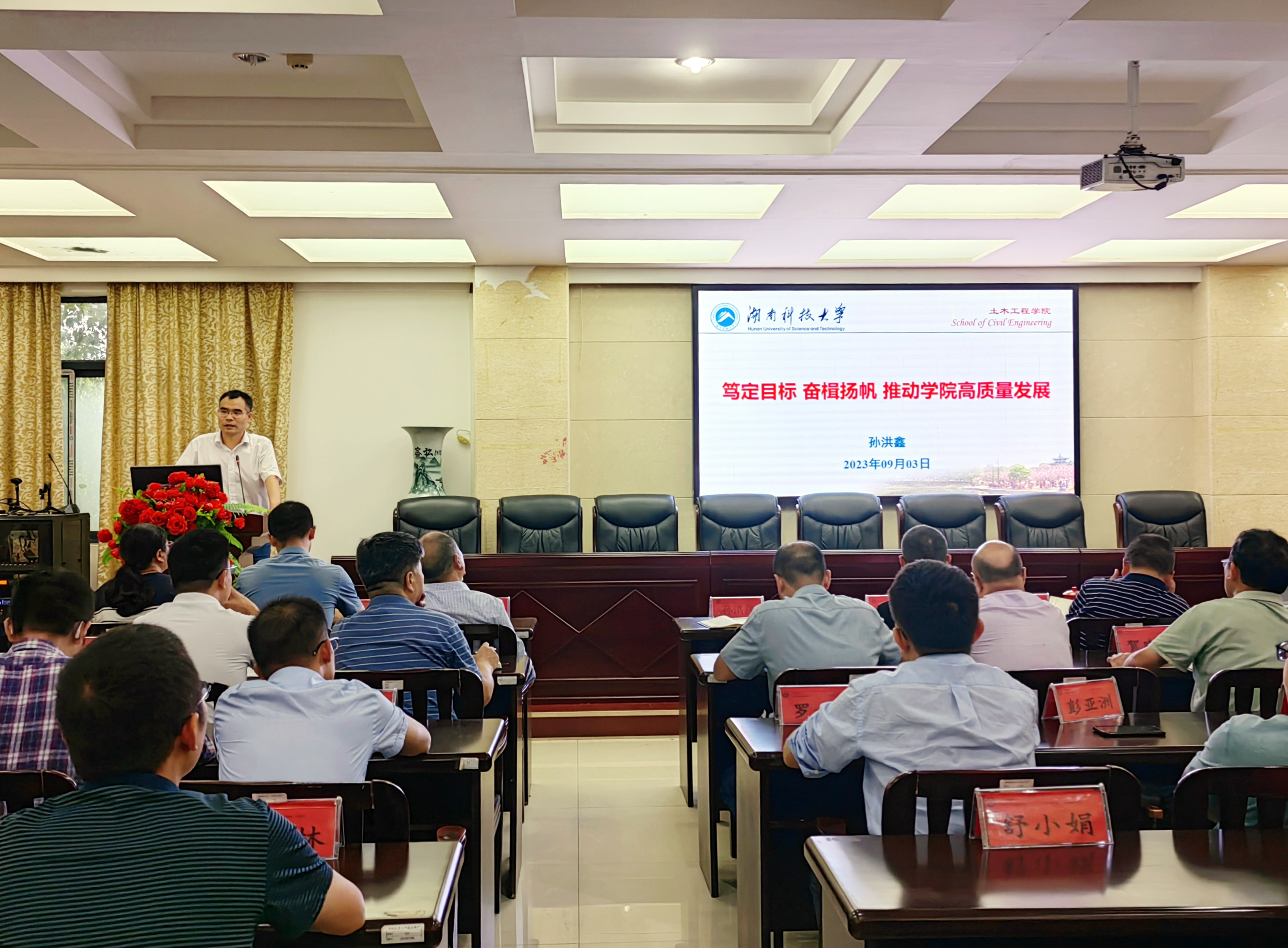 会议最后,孙洪鑫院长围绕2023上半年工作、下半年重点工作、学院发展动力三方面,作了题为《笃定目标 奋楫扬帆 推动学院高质量发展》的主题发言。孙院长强调,人才是第一资源,创新是第一动力,新的学年全院上下齐心协力,进一步明确目标,理清思路,找准定位,把握教学研究、科学研究、行政教辅、学生学工等四个方面的发展与创新,全力推动学院教育教学的全面高质量发展。