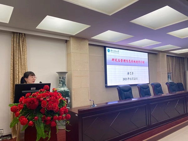 第三,学院研究生教务秘书唐艺芳博士介绍了新的研究生管理信息系统及操作流程。她以“讲解+实操”的方式进行介绍,帮助各位研究生导师更加直观地了解系统操作流程。