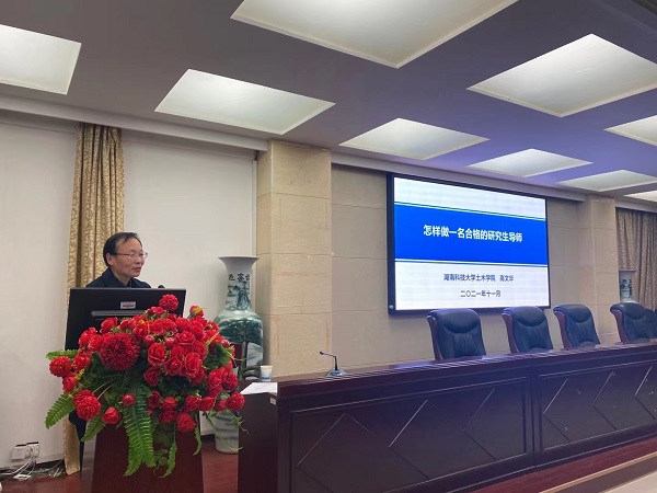 其次,湖南省优秀研究生导师高文华教授上台分享了研究生培养经验。他从当前研究生教育面临的形势、研究生导师的职责、研究生导师应有的胸怀和素质、如何定位导师与学生的关系、培养成效以及心得体会五个方面与各位研究生导师进行分享。最后,他强调,导师要“在政治上要正确引导,在学业上要悉心指导,在培养上要严格要求,在成果上要甘为人梯,在生活上要人文关怀,在学术上要严谨求实。”
