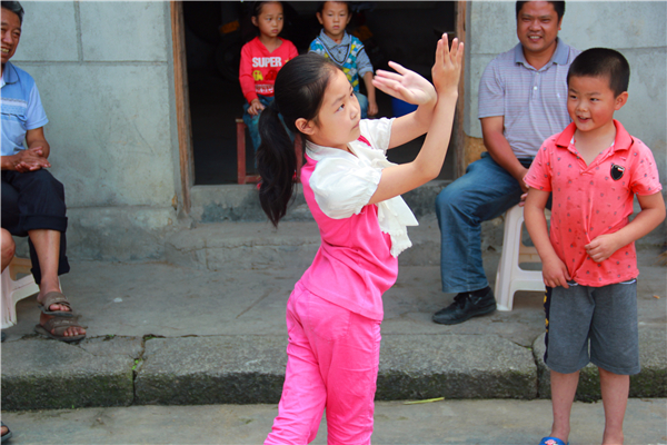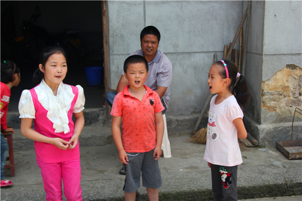 由于父母长期在外,小朋友们与外人交流的机会比较少,所以他们在刚见到前来探望的哥哥姐姐们时,显得有点拘束。但在之后的交流中,孩子们渐渐的与小队成员熟悉了起来,变得活泼大胆,乐于展现自己。三位小朋友为大家合唱了一首《茉莉花》。一位身穿红衣的小女孩还用自己优雅灵动的舞姿赢得了在场人员的阵阵掌声。随后,成员们还和小朋友们进行了俯卧撑比赛等活动。看着孩子们天真无邪的笑容,大家觉得十分开心与欣慰。