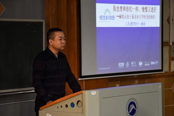 土木学院97级毕业生颜跃在演讲伊始用火柴人的故事告诉同学们大学是一个社会的缩影,并且每个人生活的圈子是不一样的,将大家带入了深思。然后,他又以在大学里面“学习”和“成长”最重要作为中心,分别从如何坚持学习、如何合理安排课余时间、如何处理学习和工作的关系等五方面为同学们做详细的解说。他说:“学习是成长的核心,它能够让我们去适应一个全新的领域和这个瞬息万变的时代。”同学们听完后台下响起了热烈的掌声。